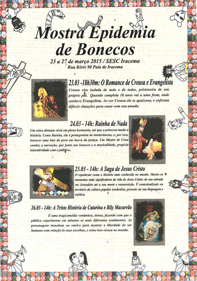 Mostra Epidemia de Bonecos – com as peças: O Romance de Creuza e Evangelista, A Saga de Jesus Cristo, A Triste Estória de Catarina e Bily Macarrão” e “Rainha de Nada”, Sesc Iracema - Fortaleza, Ceará