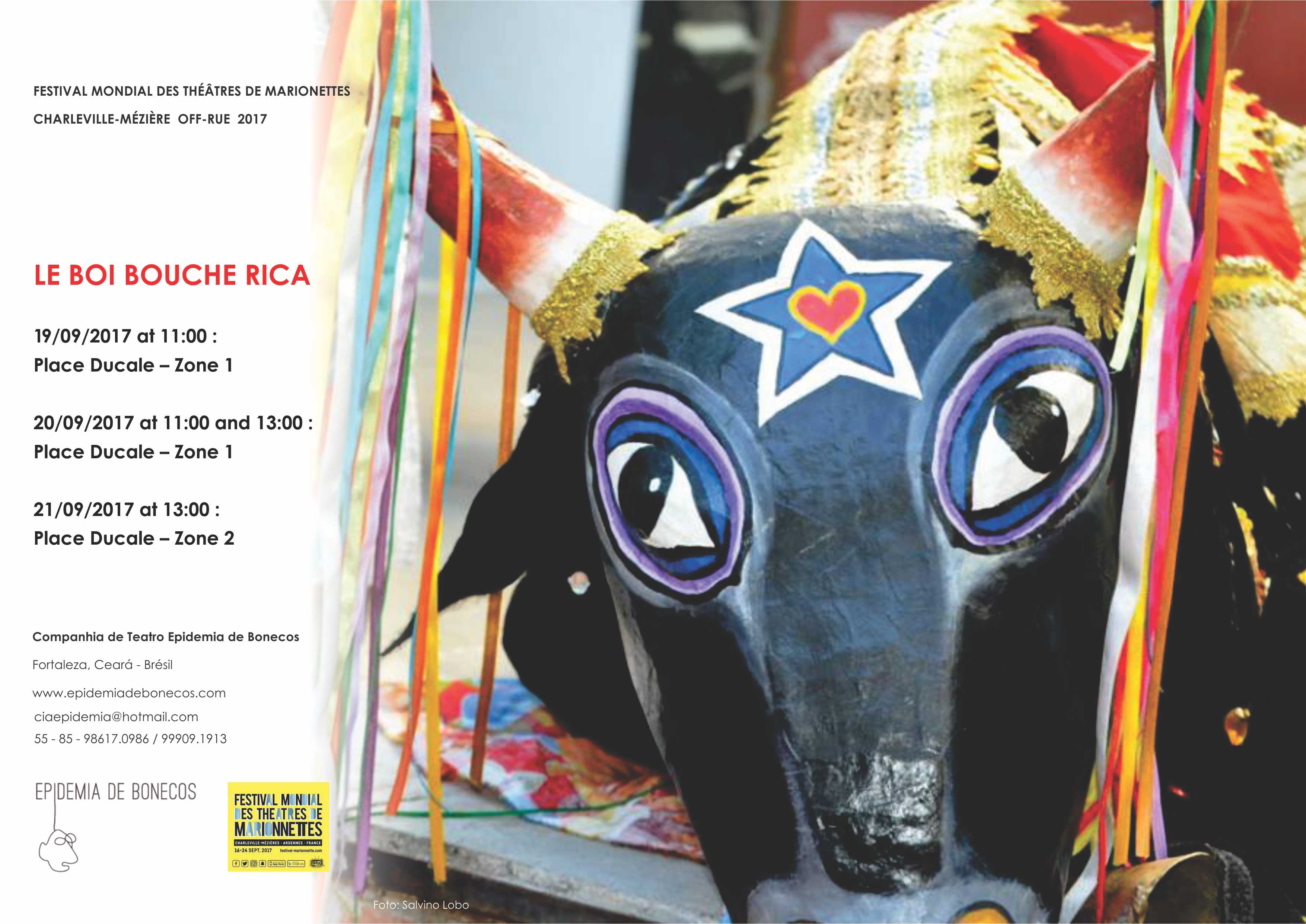 2017 Festival Mondial des Theatres de Marionnettes, com as peças “O Boi Boca Rica” e “O Romance de Creusa e Evangelista” - Charleville- Mèziére, França.