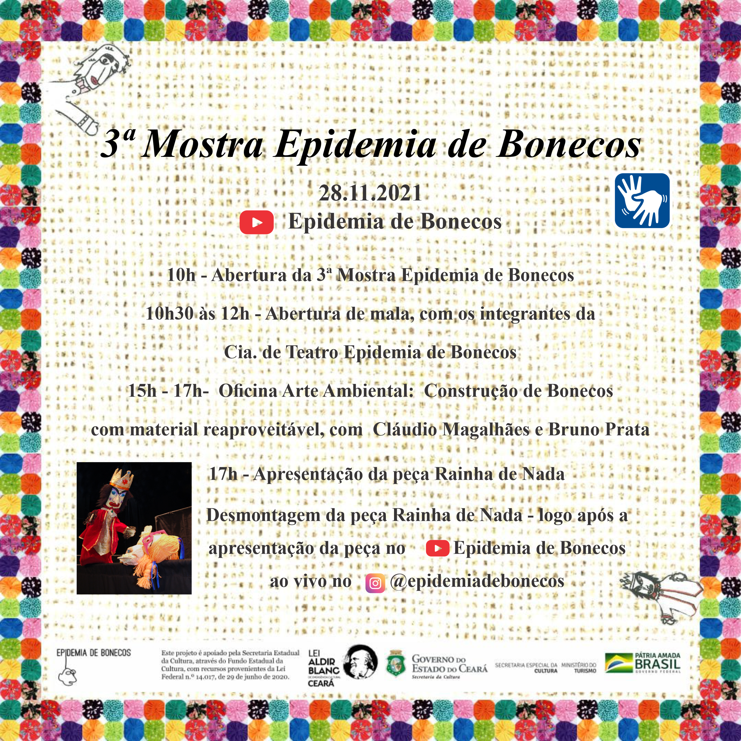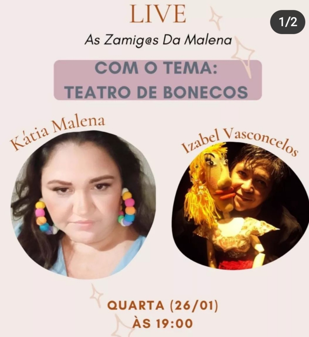 2021 3ª Mostra Epidemia deBonecos, com aspeças A Rainha de Nada, A Triste História de Catarina e Bily Macarrão e Pas de Temps. Apresentadora da Mostra. Virtual, pelo Canaldo you tube da Cia. Epidemia