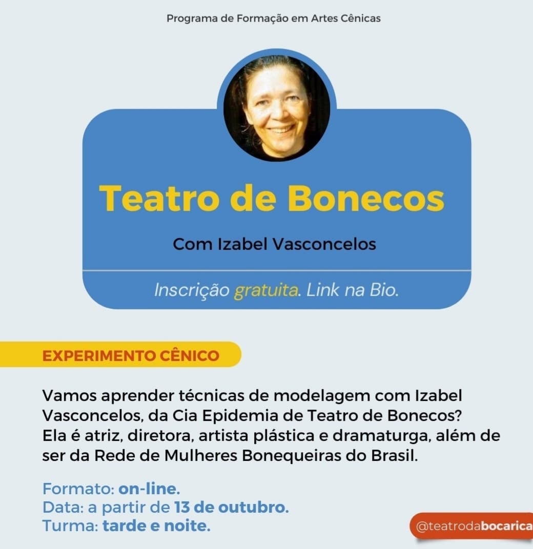 Izabel Vasconcelos é atriz e diretora do teatro de bonecos, é dramaturga, produtora e gestora cultural. Graduada em Artes Cênicas pelo Instituto Federal de Educação, Ciência e Tecnologia do Ceará - IFCE. Iniciou o trabalho com teatro em 1982, no Grupo de Teatro Raça, e no Teatro de Bonecos em 1985 com o Grupo Folguedo. É criadora, produtora e diretora da Companhia Epidemia de Bonecos em 1997. Trabalhou como gestora cultural de 1998 até 2020 na Secretaria de Cultura e Turismo de Maracanaú. Seus principais projetos como produtora atriz bonequeira e pesquisadora, nos últimos anos foram: O Cassimiro (2023), Caminhos do Cassimiro (2021), III Mostra Epidemia de Bonecos (2021), A Saga de Jesus Cristo (2022) Projeto Papiro (2021), Lives Epidemia.com (2020), O Auto do Boi Boca Rica (2021), Pas de Temps (2022), Festival Abril com Bonecos (2020), Bonecarte (2019).
