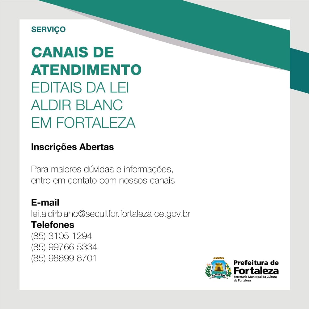 A Prefeitura de Fortaleza, por meio da Secretaria Municipal da Cultura de Fortaleza (Secultfor), divulga os editais de ações emergenciais ao setor cultural referentes à Lei Aldir Blanc. Inscrições devem ser realizadas por meio do Mapa Cultural de Fortaleza (https://mapacultural.fortaleza.ce.gov.br/) até o dia 30 de setembro de 2020.