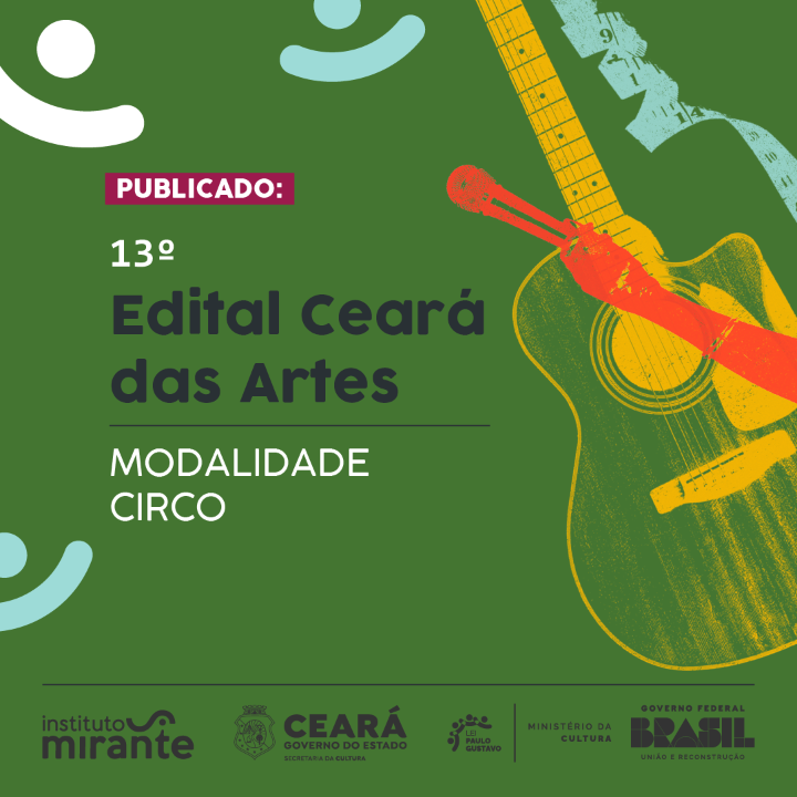 O 13º EDITAL CEARÁ DAS ARTES é uma ação continuada da Secretaria da Cultura do Ceará. Anteriormente denominado Edital de Incentivo às Artes, tem como objetivo incrementar a criação e a produção cultural, por meio de iniciativas individuais ou coletivas de artistas, curadores, pesquisadores, produtores, educadores e demais profissionais que realizam atividades no campo das artes. Fomentando processos de criação, produção, difusão, formação, pesquisa, intercâmbio e fruição das expressões artísticas; Incentivando a sustentabilidade de artistas, grupos, coletivos, companhias e demais profissionais e empreendimentos culturais; Valorizando a produção artística do Estado, contribuindo para a geração de renda de artistas, técnicos e fazedores de cultura em geral, grupos, coletivos e companhias culturais, contribuindo para a inclusão social, o fortalecimento da cidadania e a efetivação dos direitos culturais no estado do Ceará