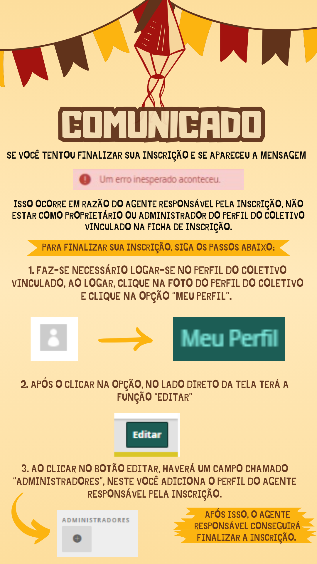 Motivo: Isso ocorre em razão do agente responsável pela inscrição, não estar como proprietário ou administrador do perfil do coletivo vinculado na ficha de inscrição.